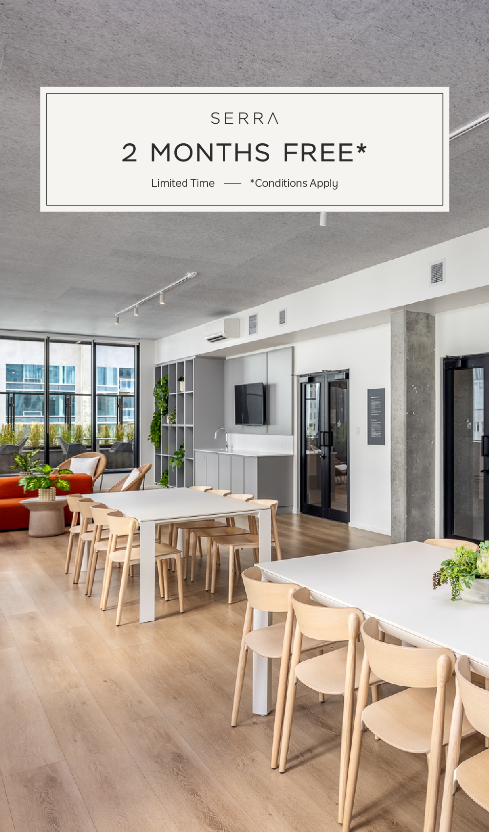 Located in the heart of downtown Montréal, SERRA offers 245 new apartments for rent, from studios to two-bedrooms. Each unit showcases a sophisticated architectural concept inspired by nature, with timeless design, natural materials, and bright, open spaces. Apartments overlooking the courtyard and its expansive garden create a calm retreat in the city. With a 12-month minimum lease, SERRA is ideal for students, young professionals, couples, and families seeking comfort and convenience in Montréal’s vibrant urban core.